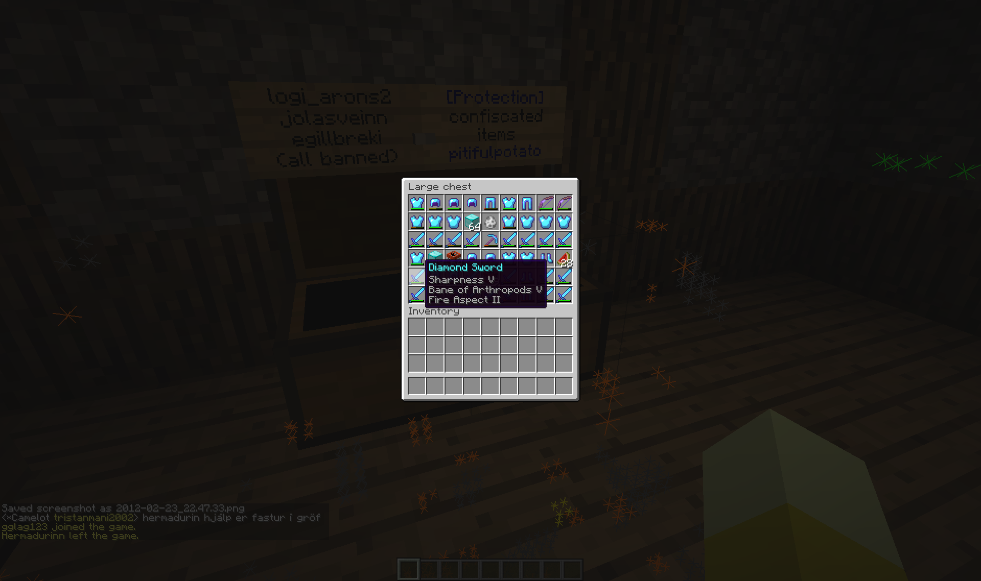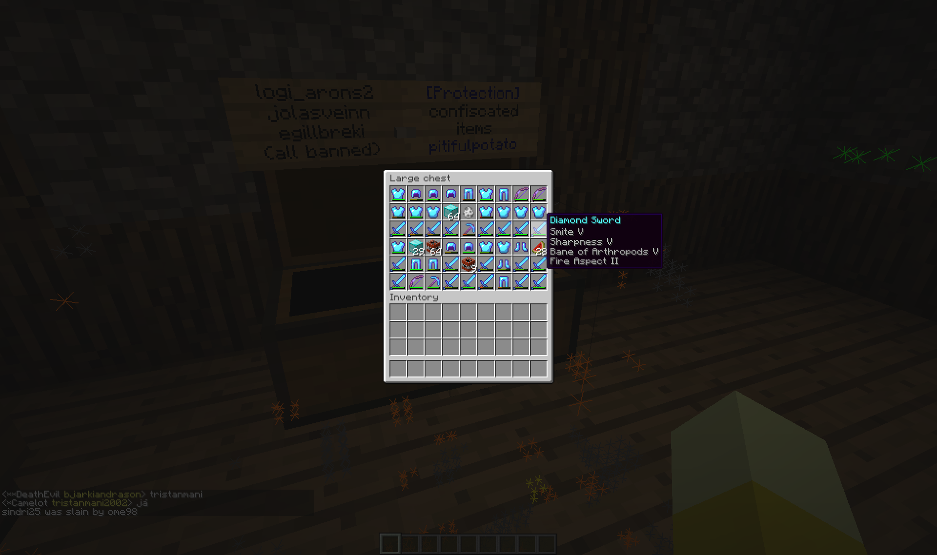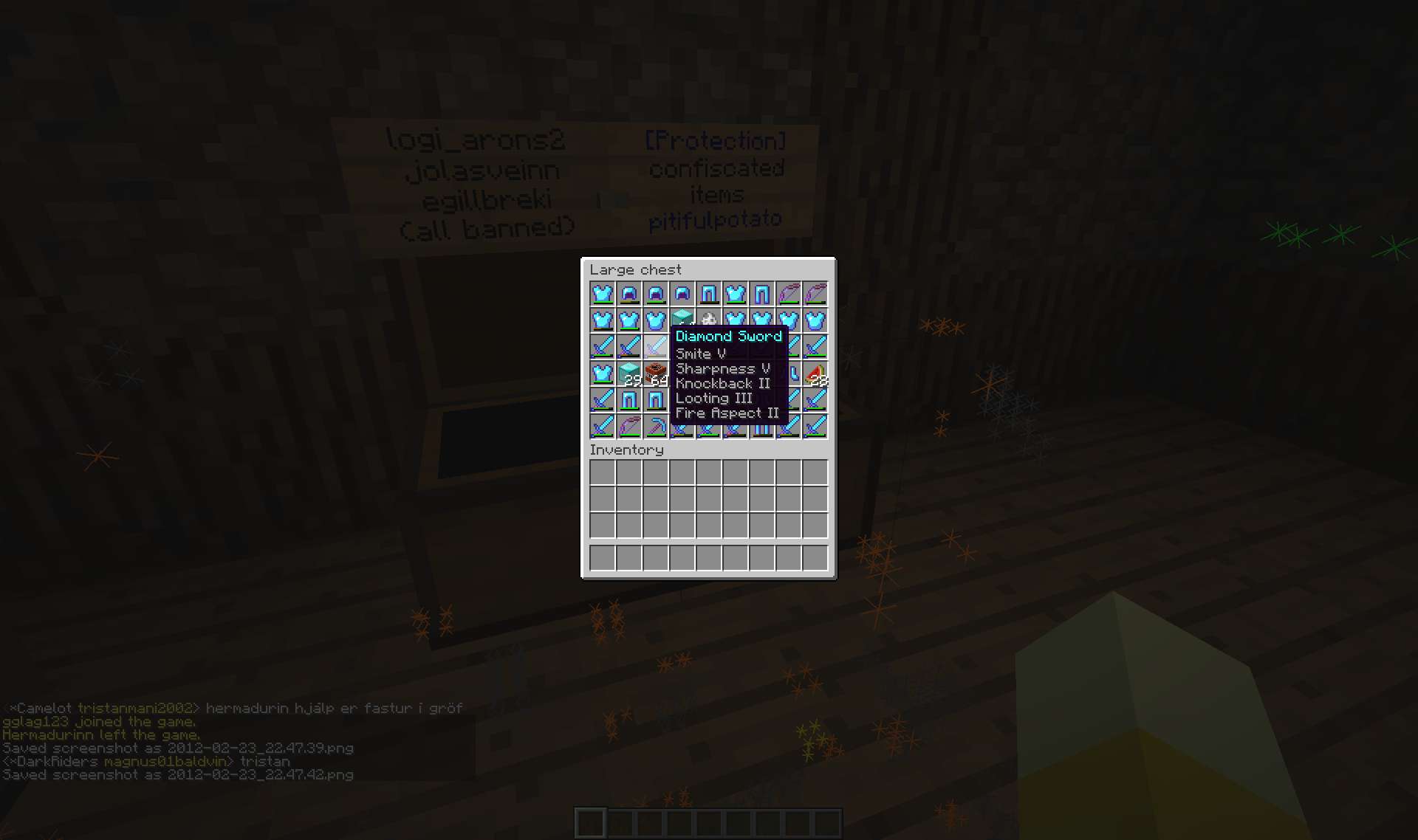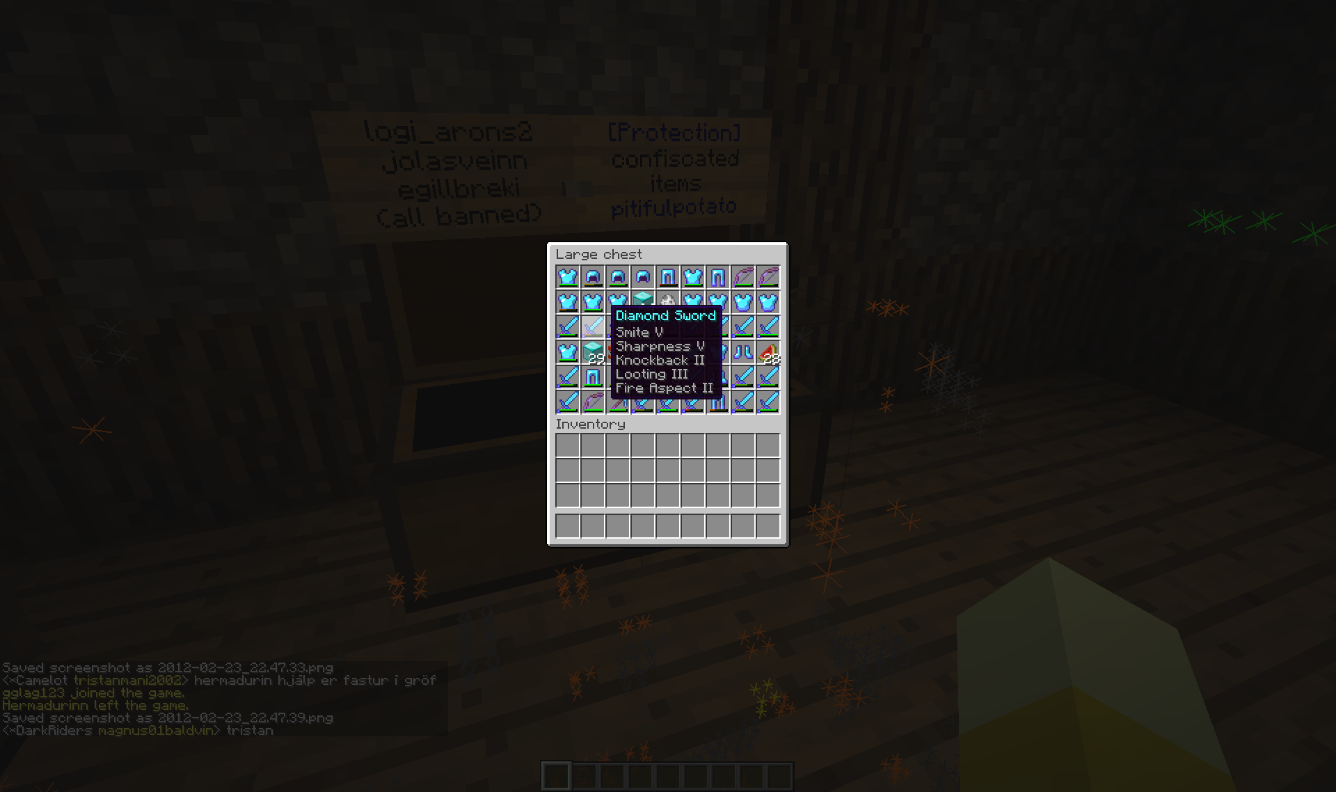 Það sem gerðist í dag er að GummiA og Pitifulpotato fóru í kisturnar hjá Jolasveinn/Egillbreki og fann stolið stuff, svo fundu þeir fleira stolið stuff frá helgi9000,xXstormanXx og Gusti101, ég sagði honum að banna ykkur 3 ef hann væri viss um að þetta væri hans stuff og stolið. Ég get ekkert annað gert en að treysta að mínir admins viti hvaða stuff er stolið, allavega ef hann sér þessi super enchanted admin sverð þá er maður nokkuð viss...ég sagði við Gusti101 þegar ég unbannaði hann að hætta öllu þessu veseni og skila öllu stolnu stuffi(hann veit það vel) en samt hélt hann áfram að reyna nota þessi stolnu items. Hér eru screenshots af öllu sem er 100% stolið af admin. Ég veit vel að GummiA var mjög heimskur að vera geyma allt þetta í kistum sem voru unprotected, en ég gaf ykkur sjéns á að skila þessu. Og vinsamlegast hættið að kenna gglag123 um þetta, hann hjálpaði ekki neitt í að banna ykkur, það voru GummiA og Pitifulpotato sem gerðu sitt starf sem admins að koma ykkur á bakvið lás og slá.