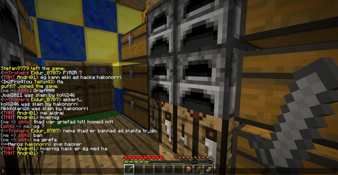Eidur og Djpalli griefudu med því að spawn killa í hominu okkar gulli9000 svo drápu þeir hann með sharpness IV og allt besta stuffið mitt og adminar plz banan þá fyrir griefid fljótt